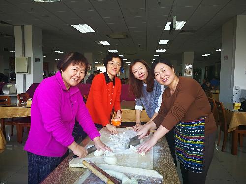 禁忌书屋 » 教工之家 财税分工会举办2018年“庆新年包饺子”活动 发布日期:2018-01-08 2018年1月3日中午,为庆祝新年到来,丰富教职工生活,在分工会主席陈蕾、委员吴晖和张晓慧的组织下,财税分工会在教工食堂举办2018年“庆新年包饺子”活动。校工会常务副主席刘俊虹出席活动。全院教职工和退休教师30余名参加活动。 活动开始后,学院院长姚东旭、党委书记李红霞积极带头,老师们三五成群、自由组合,擀皮包陷、配合默契。包好的饺子整齐精美、各具家乡特色。经过一个半小时的努力,热腾腾的饺子出锅了!大家围坐在一起,品尝美味的劳动成果,互送真挚的新年祝福。现场既热闹又开心,可谓其乐融融。