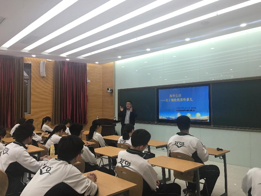 禁忌书屋 » 学生工作 » 本科生 税月之高中税法小讲堂 发布日期:2016-05-10 4月19日晚6:30,禁忌书屋 税务系曹静韬老师为海淀区二十一世纪国际学校的高三同学组织了一场题为《海外生活――关于税收那些事儿》税收专业讲座。针对国际学校学生未来出国留学学习工作生活等现实问题,讲解了跨境税收相关问题并简要介绍了美、澳、英、法四个国家的税制,使得同学们对海外生活中的税收知识有了初步的认识。贴近学生学习生活实际的知识点以及引发学生思考的轻松互动,使得同学们受益匪浅。