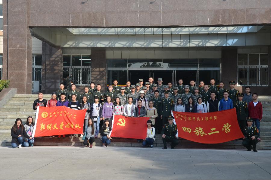 今年正值抗战胜利70周年,为弘扬抗战精神,共筑复兴之梦,促进军地文化交流,增进彼此友谊,建立长期合作关系,2015年10月24日,财税学院学生第二党支部携手郭明义爱心团队一同走进中国人民解放军装甲兵工程学院,与装工院四旅二营党支部开展以“追溯抗战历史,缅怀革命先烈,交流共建学习型党支部”为主题的交流活动。