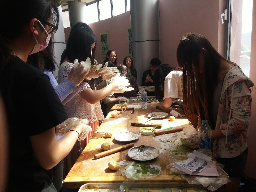 不到12点半,活动现场就热闹起来,参加活动的同学陆续到达。首先在干事们的引导下,同学们领取了手套和口罩,接着每人领了一个面团,开始制作。拿着手中的面团,同学们都跃跃欲试,面粉、抹茶粉和巧克力酱齐上阵。只见同学们使用擀面杖和不同的模具制作出了各种极具特性的饼干,有的人还用巧克力做了点缀。很快一盘盘的饼干制作完成,被送入烤箱。