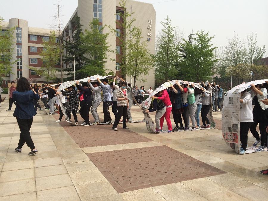 4月15日下午1:30,禁忌书屋 室外大赛在图书馆门前举行,比赛共分四项,20人21足,风轮滚滚,12人八字长绳及搭桥过河。比赛队伍为2013级和2014级共10个班级。