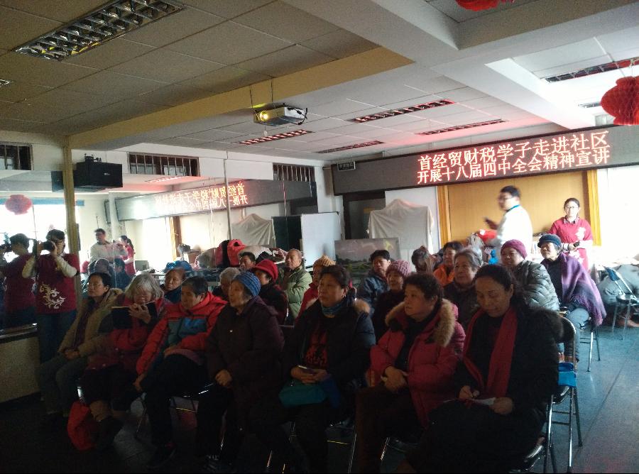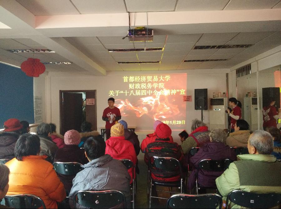 1月29日上午,财税学院四名同学闫晴、葛海?h、宋宗翰和陈实响应校团委号召,在分团委书记高敏丽带领下走进什刹海街道前铁社区开展十八届四中全会精神宣讲和慰问失独老人活动。前铁社区党组书记高艳红亲切接待了老师同学们并精心安排了本次宣讲。社区30余名大爷大妈聆听了宣讲。