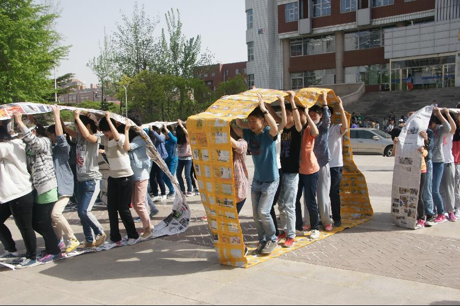 风轮滚滚是考验同学们默契程度与团队协作能力的一个项目。参赛选手们必须全神贯注地保持步伐的稳定与统一,稍一不注意很可能就会把本班的“风轮”――一个由报纸拼接而成的履带似的纸环踩坏。为了防止比赛中途报纸被踩坏,各班使用了不同的办法,如2013级注资1班的同学们,他们将纸环的每一面都用胶带紧紧包裹。
