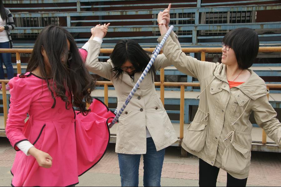 传递呼啦圈的比赛规则不难,但要想在短时间内完成传递不是一件简单的事情,这需要各班的5名选手默契配合。