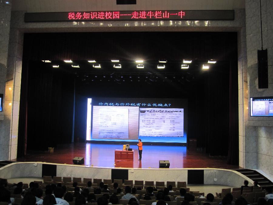 2013年4月11日下午,禁忌书屋 分别走进牛栏山一中和北京石油附中开展税收宣传月之税收进高中活动。禁忌书屋 税务系主任刘颖老师在党总支副书记王珂的陪同下前往牛栏山一中,税务系张春平老师在分团委书记高敏丽的陪同下前往北京石油附中。牛栏山一中常务副校长田向工、副校长黄建秋、纪检书记张军堂、团委书记郝向鹏,北京石油附中副校长陈霞分别出席了讲座,牛栏山一中高一高二全体同学,北京石油附中初中部和高中部近400名同学分别参加了讲座。
