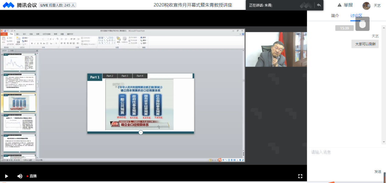 黄春元副教授谈到:“朱青教授从国家财政收入四本账入手,分析占比24%的一般公共预算收入中税收的重要性,极大地鼓舞财税专业同学的学习热情。朱老师通过诙谐幽默的语言和接地气的实例将枯燥压抑的专业问题,化解为易理解又生动的一个个小知识点。接下来,我们还有一系列的税收宣传月活动,疫情期间线上的宣传活动,让人期待!”