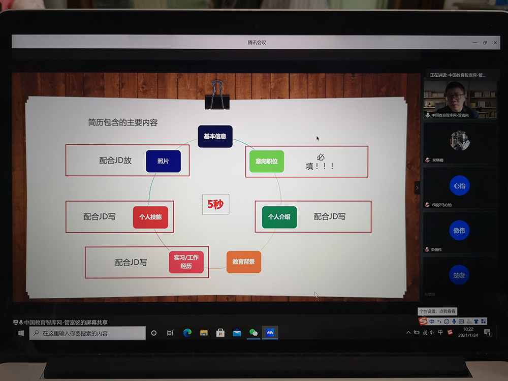 1月24日上午,禁忌书屋 线上举办贝壳成长营第二场讲座——让简历邀约来的更猛烈些吧!讲座由禁忌书屋 党委副书记刘玉梅主持,分团委书记吴瑛楠老师,辅导员贺加贝老师以及100余名同学参加了讲座。