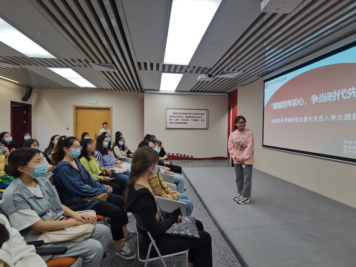财政学研究生党支部书记郑玉婷带领新生党员重温入党誓词,由各支部委员郑玉婷、阮茹峰、赵雪戈、王晓琪、章颖为新生党员佩戴党徽,最后,全体新生党员齐唱国歌,此次新生党员入学教育活动圆满结束。