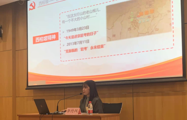 李丹凤首先从“赶考”二字——我们不断地在面临各种“考试”,引出我们党的赶考之路:从南湖红船出发,我们党走向井冈山,走向延安,走向西柏坡......西柏坡精神同红船精神、井冈山精神和延安精神等一同伴随着中国革命的光辉历程,共同构成了我们党在前进道路上战胜各种困难风险、不断夺取新胜利的强大精神力量和宝贵精神财富。