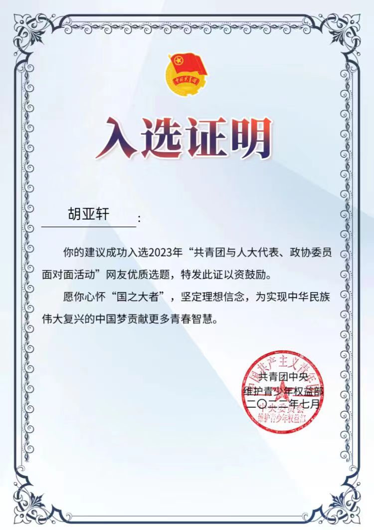 财税新青年|禁忌书屋 胡亚轩同学荣登2023年“共青团与人大代表、政协委员面对面”活动优质选题建议榜