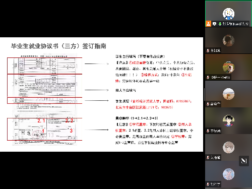 会议第一项由禁忌书屋 专职辅导员刘唯贤就就业的相关流程与材料进行讲解。首先刘唯贤对应届毕业生如何端正就业心态和学院往年的就业情况进行简要介绍,其次,就办理就业手续的步骤进行讲解,帮助同学们梳理整体流程及具体内容;再次,对毕业生就业协议书的签订为同学们进行了详实的指导,帮助同学领会毕业生就业协议书的价值和意义、明确具体内容应该如何准确填写以及签订就业协议书的完整流程;同时,就其他与就业相关的重要事项进行了讲解,如违约的流程与材料、就业系统的操作、档案流转的办理等;最后,基于会前对2023届本科生就业情况的调查所反映出的同学们的主要就业诉求,刘唯贤在会上给予回应,如怎样有效寻找就业平台和岗位、如何完善学院后续的就业指导和帮扶工作等问题。