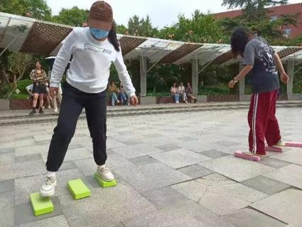 第三个项目是“脚踏实地、奋进征途——摸石过河”。该项目要求队员依次将河石踩在脚下交替向前,考验同学们的耐心与平衡感。在比赛中,同学们互相鼓励、步步为营,最终到达终点。这个项目也告诉同学们要踏踏实实地走好每一步。