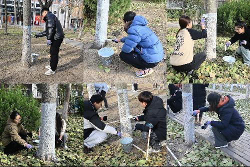早上十点,师生、团员青年齐聚博学楼南侧杨树林。物业保障中心绿化组职工介绍了杨树涂白作用以及操作注意事项。师生团员们分工配合、齐心协力,仔细粉刷树干的每一个角落,共同为杨树穿上了“防虫保暖衣”,杀灭树皮内的病原菌及虫体,防止树木因冬季低温冻伤,帮助它们顺利过冬。经过一个多小时的辛勤劳作,杨树林焕然一新。在劳动过程中,师生、团员青年团结协作,促进了彼此的交流,留下了美好的回忆。