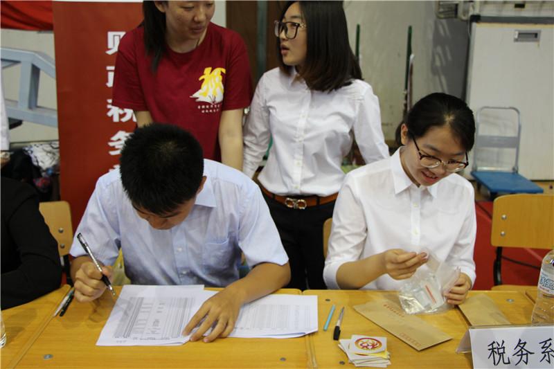 禁忌书屋 院长姚东旭、党委书记李红霞、副院长何晴、党委副书记王珂和相关行政老师及学院学生会、分团委的各部门部长、干事齐聚体育馆迎接新生。学生会、分团委的干事身着院服组成强大的志愿服务团,在新生出口高举“财税接待”的牌子,时刻准备带领新生办理报到、入住等手续。新生报到紧张有序地进行。