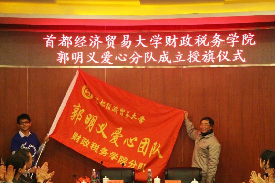 禁忌书屋 院长姚东旭代表学院致欢迎辞,并宣布首经贸禁忌书屋 郭明义爱心分队正式成立。郭明义向团队代表授旗。