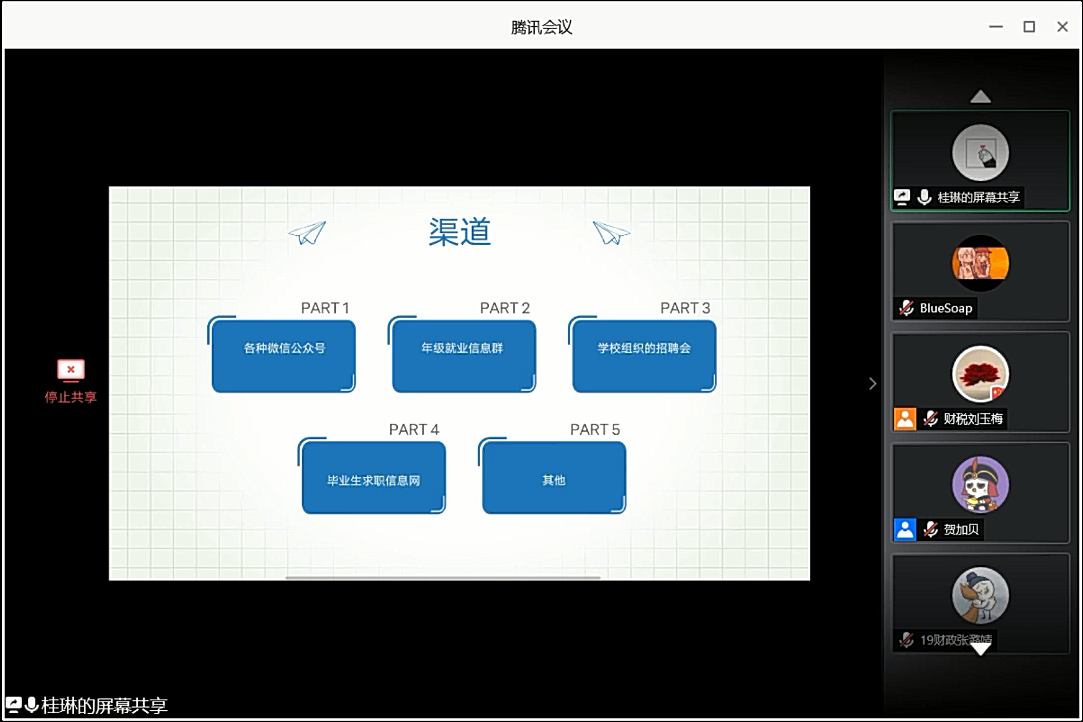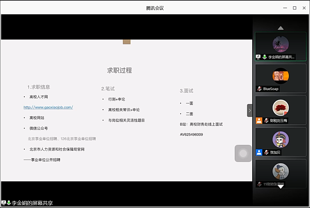 2021年1月24日下午,禁忌书屋 举办贝壳成长营第三场就业辅导活动——校友沙龙,此次会议由贺加贝老师主持。会议邀请到分别就职于天津商务职业学院的周丹、北京建筑大学的李金娟、普华永道的谢浩然和国家电网的桂琳等四位已经毕业的学长学姐为同学们进行求职经验分享。